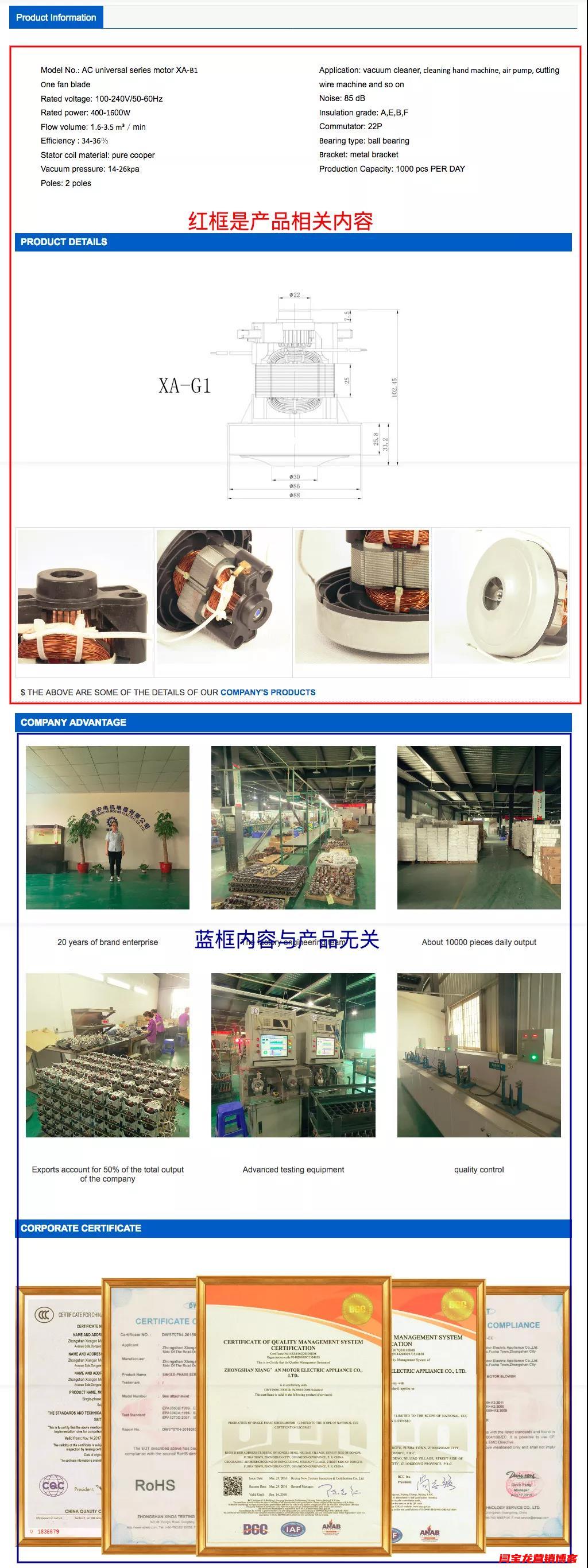 這種產品說明基本上不會有轉化,關于產品專業內容介紹太少,放的都是工廠圖片和證書,跟產品沒有太大關系,客戶在這個頁面里找不到他想要的產品內容,所以很難有轉化。